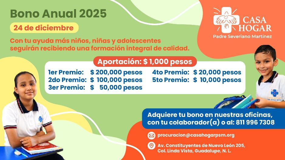¡Ayuda a construir un futuro brillante! Con tu aportación contribuyes a seguir brindando educación integral de calidad a niños, niñas y adolescentes. ¡Además, tendrás la oportunidad de ganar uno de los cinco premios! 1er Premio: $200,000 pesos 2do Premio: $100,000 pesos 3er Premio: $50,000 pesos 4to Premio: $20,000 pesos 5to Premio: $10,000 pesos Puedes adquirir